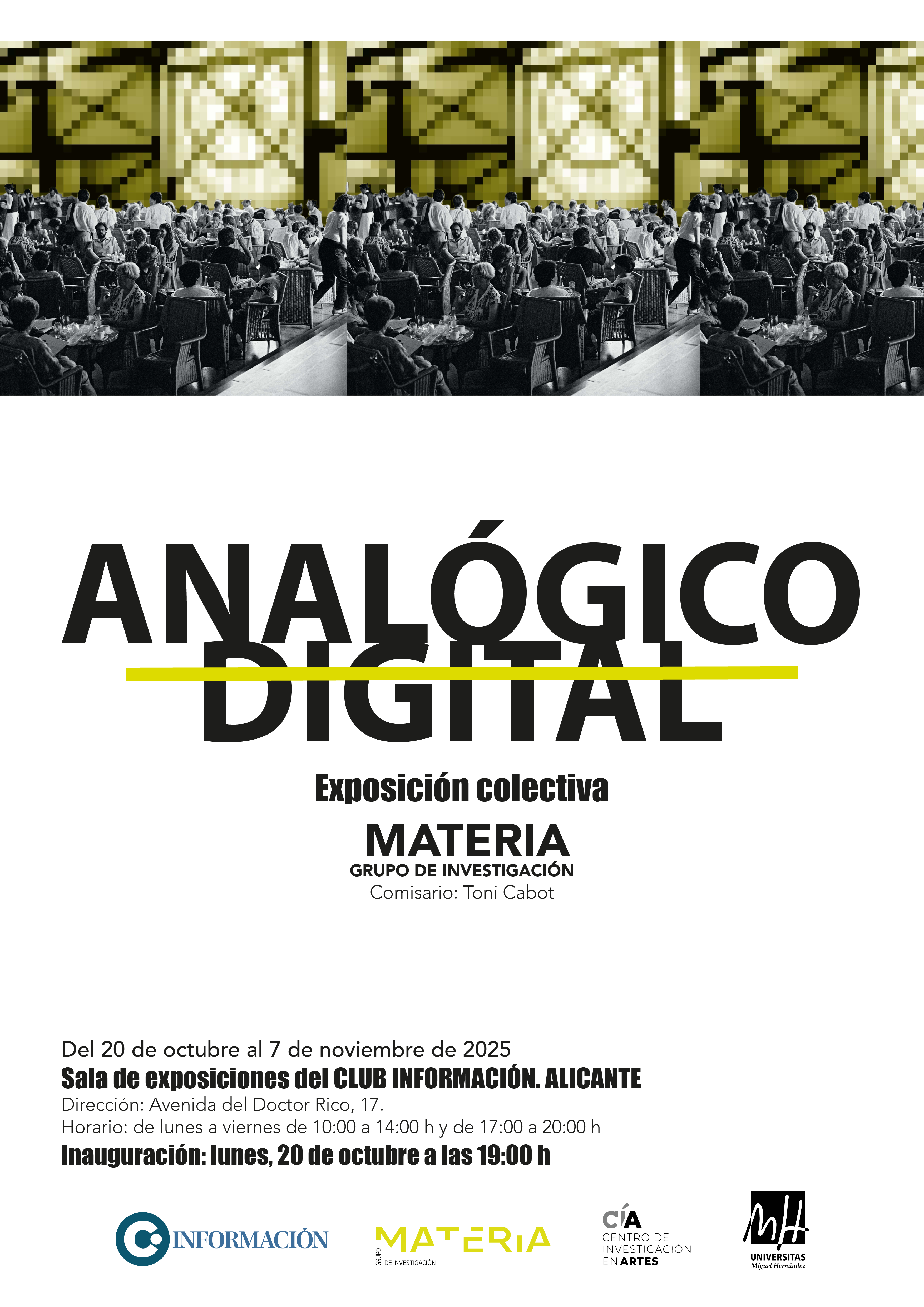 La sala de exposiciones del Club INFORMACIÓN presenta ANALÓGICO / DIGITAL una exposición del Grupo de Investigación MATERIA-UMH, integrado por Amparo Alepuz, De Albacete, Imma Mengual, Lourdes Santamaría, Pilar Viviente y María José Zanón, comisariada por Toni Cabot, director del CLUB INFORMACIÓN. Inauguración: lunes, 20 de octubre a las 19:00 h